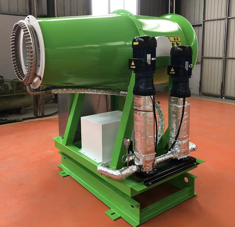 此款設(shè)備的噴霧距離是60米,配備的南方泵業(yè)的雙泵,將設(shè)備連續(xù)工作時間延長至24小時壓力能達(dá)到4Mpa,噴射出來的霧粒30微米。風(fēng)機(jī)采用的是18.5KW的節(jié)能降噪風(fēng)機(jī),整個設(shè)備啟動起來噪音低于85db。這次的噴嘴要求也很嚴(yán)格,達(dá)到了吹出來的霧落地不濕的效果。噴嘴嚴(yán)格那么過濾也得嚴(yán)格,水質(zhì)不好會堵塞噴嘴,整體設(shè)備單 配了一套過濾系統(tǒng)。還有自動泄水功能,停機(jī)即自動泄水。為了冬天 的使用,整體管路和水泵都做了嚴(yán)格的保溫設(shè)備。旋轉(zhuǎn)方面使用西門子plc系統(tǒng)單 控制設(shè)備的旋轉(zhuǎn),讓旋轉(zhuǎn)系統(tǒng)實現(xiàn)隨時左右擺動,告別限位開關(guān)時代。配電系統(tǒng)采用的全進(jìn)口施耐德,保證了整體設(shè)備的運(yùn)行穩(wěn)定性。