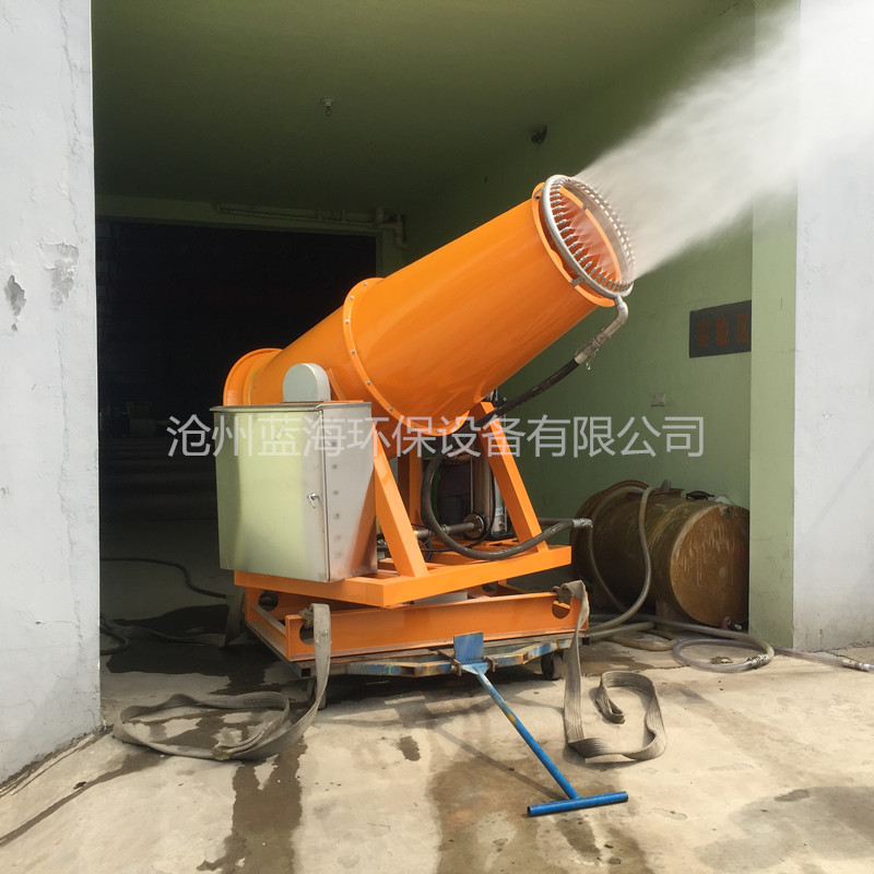 霧炮采用高壓水泵和 殊噴嘴將水霧化成直徑約10~200μm的水霧,通過高性能的遠射風機將水霧送到粉塵集中處,水霧與粉塵結合、吸附成團,在重力的作用下沉降到地面,達到有效降塵的效果。移動便捷,隨開隨走,是解決露天粉塵無組織排放和除霾 有效的產品。