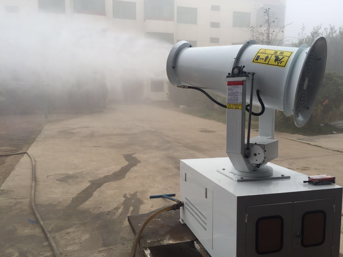 霧炮機根據(jù)液體霧化和空氣射流理論,先使用高壓泵對液體加壓,然后通過微細霧化噴嘴將水化霧化,在利用高壓射流風(fēng)機的大風(fēng)量和高風(fēng)壓將霧化的水霧送到較遠距離,使得水霧到達較遠距離的同時能夠覆蓋更大面積,在此過程中粉塵顆粒與水霧顆粒產(chǎn)生充分接觸而變得濕潤,被濕潤的粉塵顆粒繼續(xù)吸附其他顆粒而逐漸凝結(jié)成顆粒團,然后粉塵顆粒團由于自身的重力作用而降塵,從而達到抑沉,降低空氣中的PM2.5濃度值,提高空氣質(zhì)量。