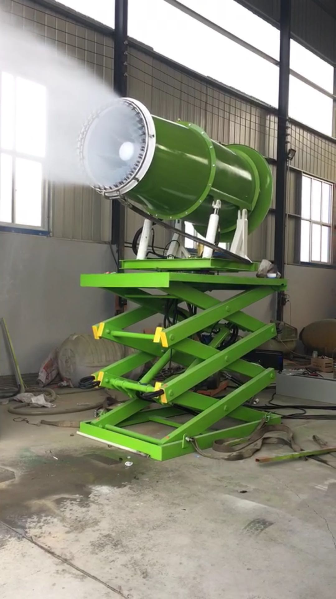 隨著環保的推進,各個城市的街道上都出現了霧炮機,霧炮機采用 的噴霧重力除塵技術。原理是通過高壓霧化水,霧炮機形成與灰塵大小相似的顆粒,并利用風扇的作用將水霧投射到指定位置。 噴霧覆蓋在地方的頂部或周邊,使灰塵顆粒在與水溶性顆粒接觸后變濕,濕的灰塵顆粒繼續吸附其他灰塵顆粒,逐漸凝結成顆粒群,通過自身重力磨削,從而達到除塵目的。